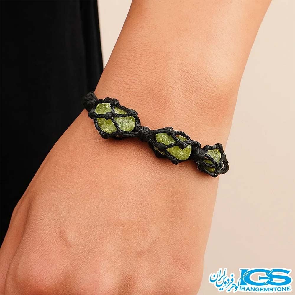 دستبند زبرجد مکرومهبافی با طراحی دستساز و استفاده از نخهای محکم و سنگ راف زبرجد، جلوهای طبیعی و خاص دارد. این دستبند قابل تنظیم بوده و برای استفاده روزانه و استایل بوهو، مینیمال یا کژوال انتخابی جذاب است. خرید سنگ زبرجد